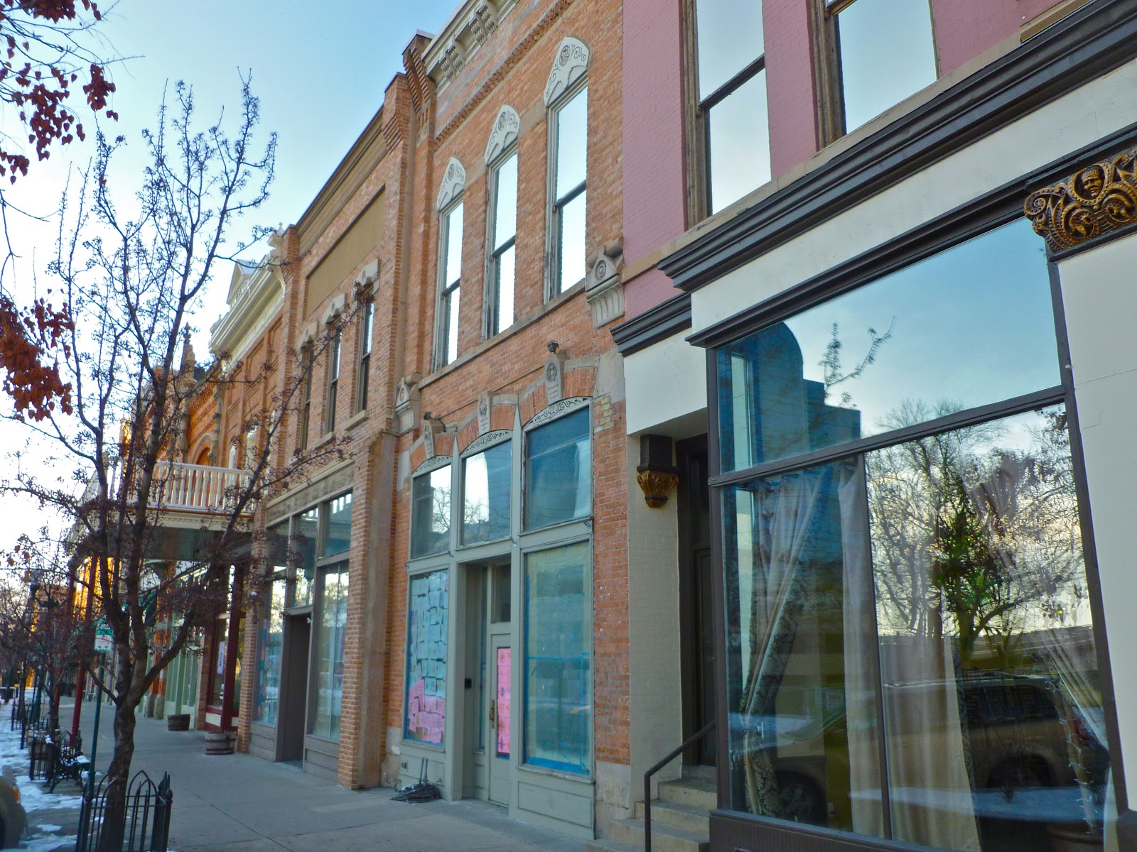 A plaque on the second building from the corner, the Southworth Block, reads: "Built in 1900 by Henry L. Southworth, this building was known historically as the Southworth Block and originally housed four businesses with a public hall of the second floor. Some of the businesses that operated in this building include the Palace Meat Market, Pal Butcher Shop, the Boston Store, theHub Clothing Co., the Cystal Restaurant, Leven's Men's Store, Heindsleman's, Daynes Optical, and the Hyde House which rented out rooms on the second floor. This building was restored in 1990."
